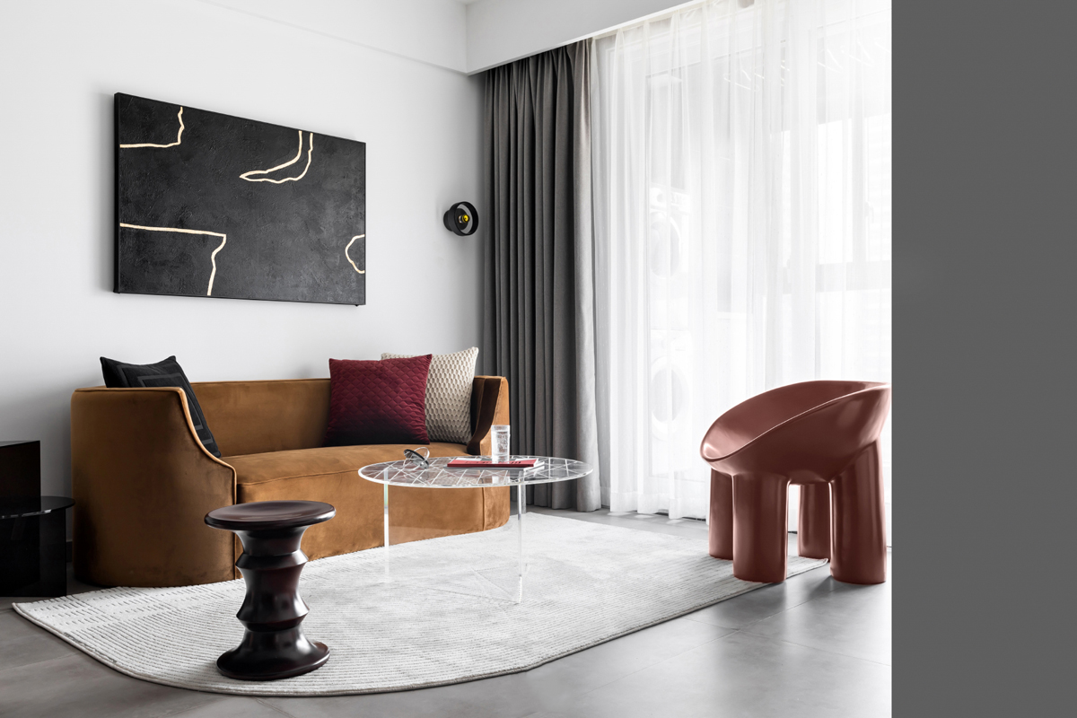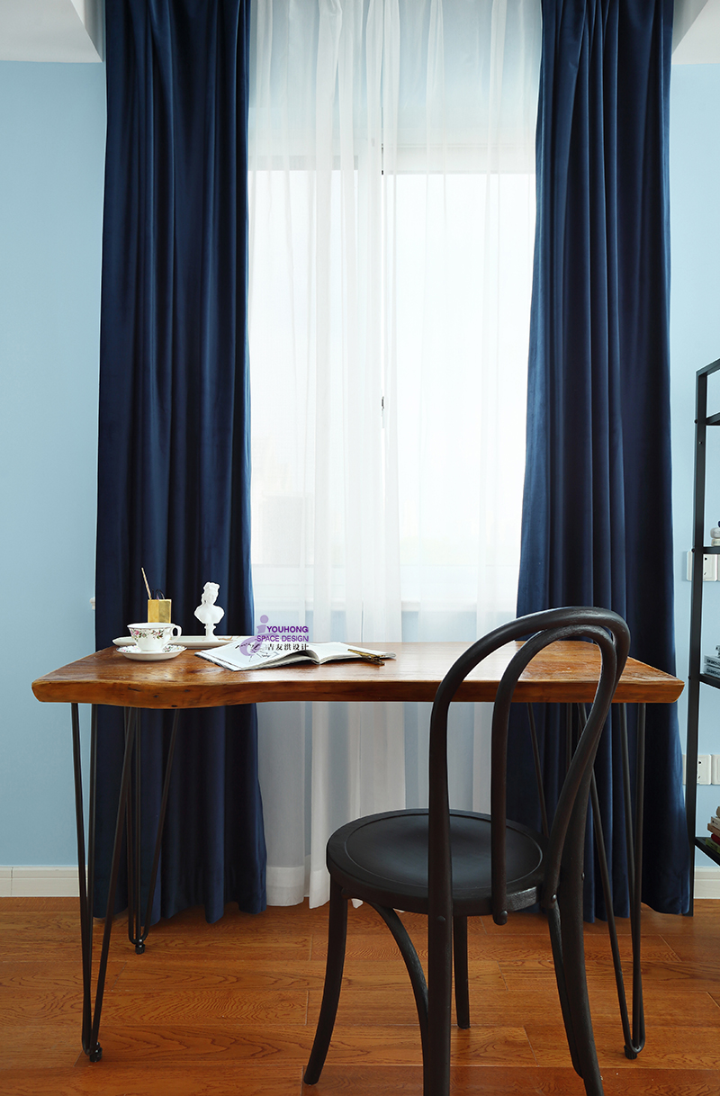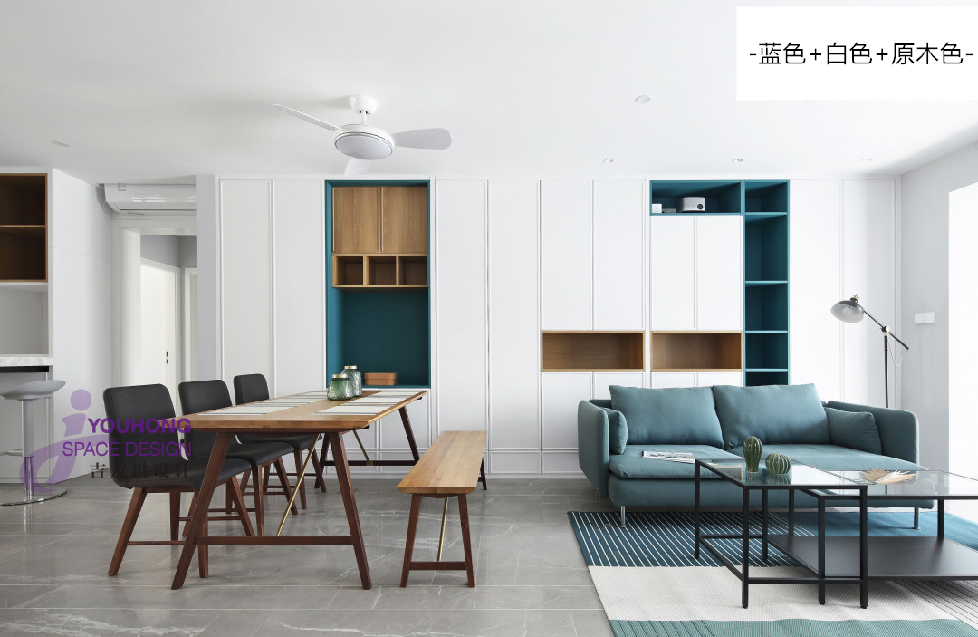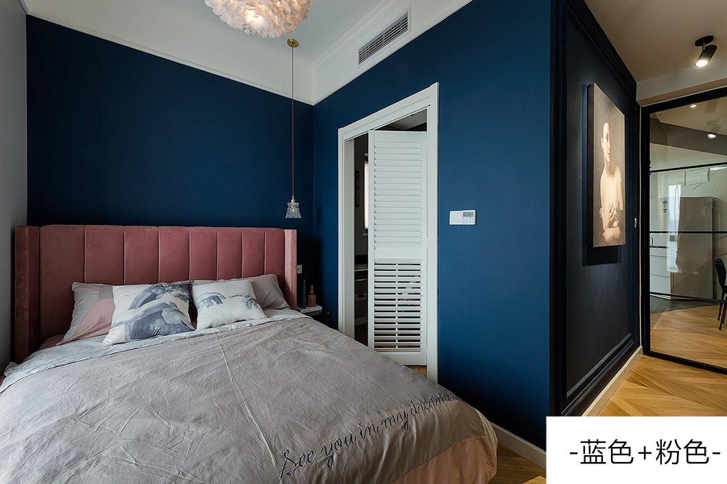 深灰+蓝色的搭配,跳脱出低调内敛,多了份俏皮有趣,表现出极强的空间层次感。