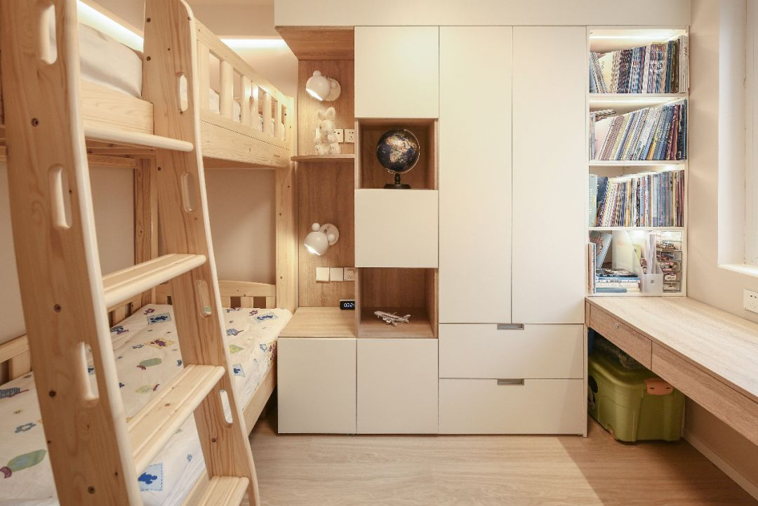 如果你想要较多的收纳空间,用“木色+白色”定制柜体也是个不错的选择,通透开阔且不失温柔。
