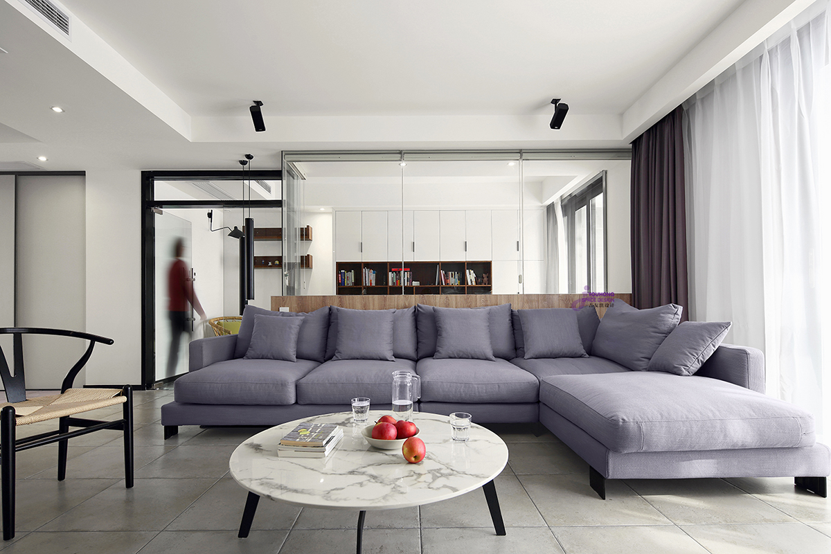 中性色调为主题色调。点缀黑色和蓝色,沉稳宁静。配饰的设计感和质感尤为重要,提升空间品位的至关因素。