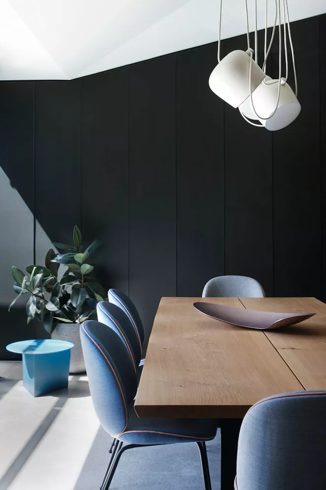 黑色墙壁,蓝色座椅,原木桌子,以及简练的室内搭配,有种Old money的从容贵气。